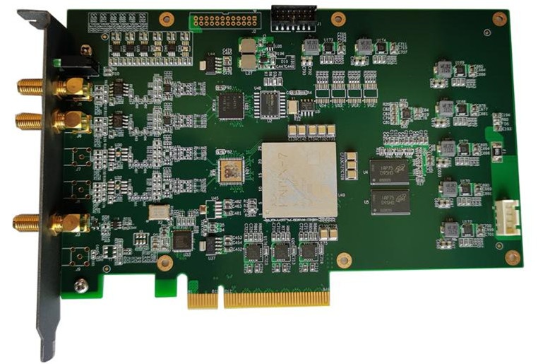 这是一款具有双通道采集、14bits(ADC)、16bits(DAC)、PCIEX8、250MSps等特征的高速采集卡,搭配高性能FPGA芯片,通过JESD204协议实现高速接口,并采用大容量缓存支持整个链路的实时传输支持,在此情形下,最高可支持2GB/s的实时数据传输。驱动程序具有良好的兼容性,支持WINDOWS、LINUX多个版本。